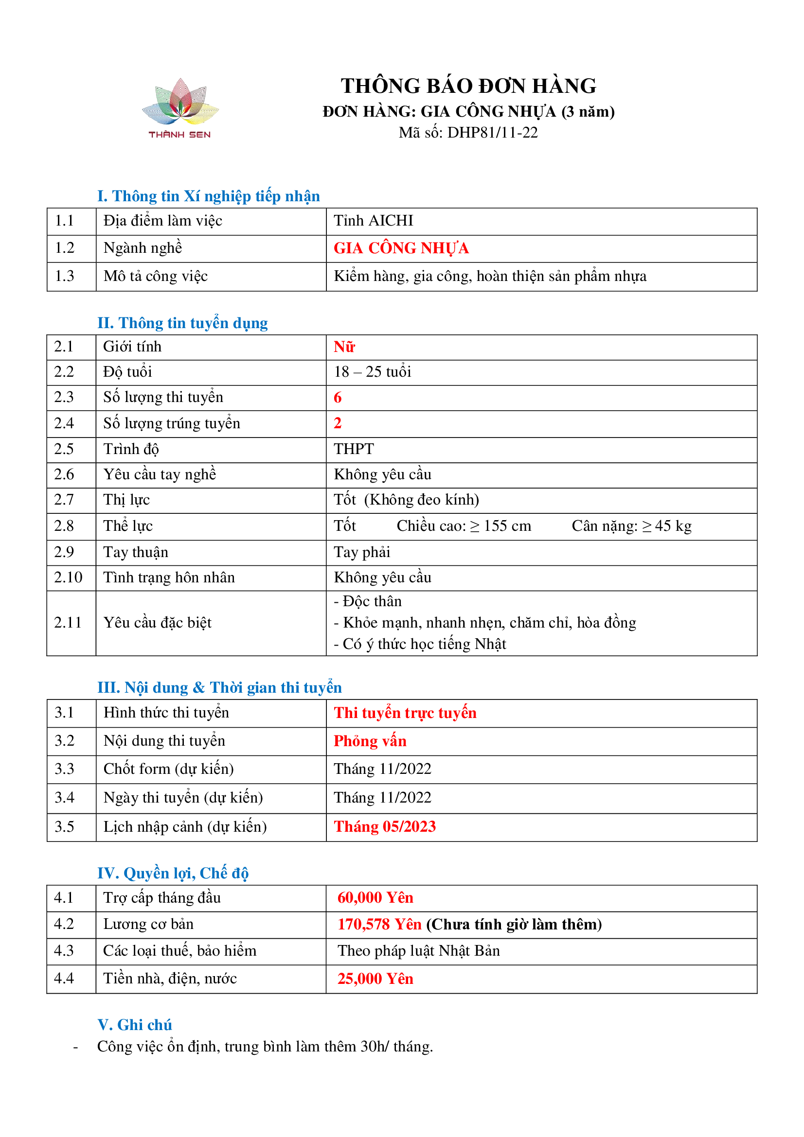 Thông tin chi tiết về đơn hàng và chương trình lao động tại Nhật Bản, xin vui lòng liên hệ: