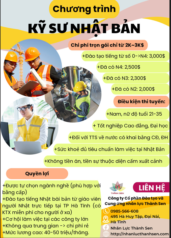 Nhằm đảm bảo thu nhập và cuộc sống ổn định cho người lao động khi đi xuất khẩu lao động diện kỹ sư Nhật Bản, Công ty Nhân lực Thành Sen luôn tiếp nhận những đơn hàng chất lượng. Một số đơn hàng kỹ sư đi Nhật Bản thu hút nhiều lao động Việt đăng ký tham gia như kỹ sư cơ khí đi Nhật, kỹ sư điện tử đi Nhật, kỹ sư xây dựng đi Nhật, kỹ sư công nghệ thông tin đi Nhật,…